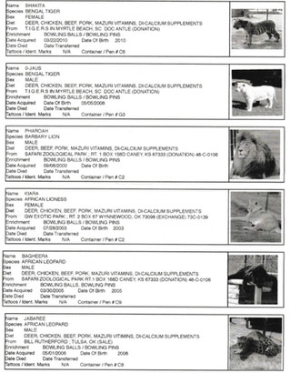 From 2014-2015, Tiger Safari sent more than 17 snow white and royal white tiger cubs to Antle; the cubs were the offspring of tigers that Antle had sent to Tiger Safari to breed. The births were not documented with the USDA and the cubs were transferred across state lines without health checks, vaccinations or veterinary certifications.